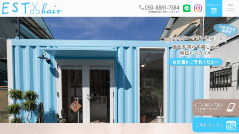 EST hairでは、カット・カラー・パーマ・縮毛矯正・トリートメント・髪質改善といった多様なメニューを用意し、お客様の髪質や悩みに応じた最適な施術を提案しています。それぞれの髪質特性を丁寧に見極めながら、自宅でも扱いやすい快適なヘアデザインを実現することを重視しており、日常生活での髪の扱いやすさを第一に考えた施術を行っています。京都府宇治市木幡御園52-73に位置し、ブルーのコンテナハウスという独特な外観が来店者の目印となっています。